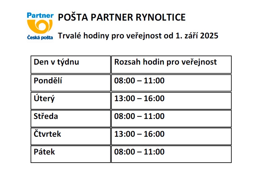 Pošta Partner Rynoltice - Změna trvalé otevírací doby od 1.9.2025